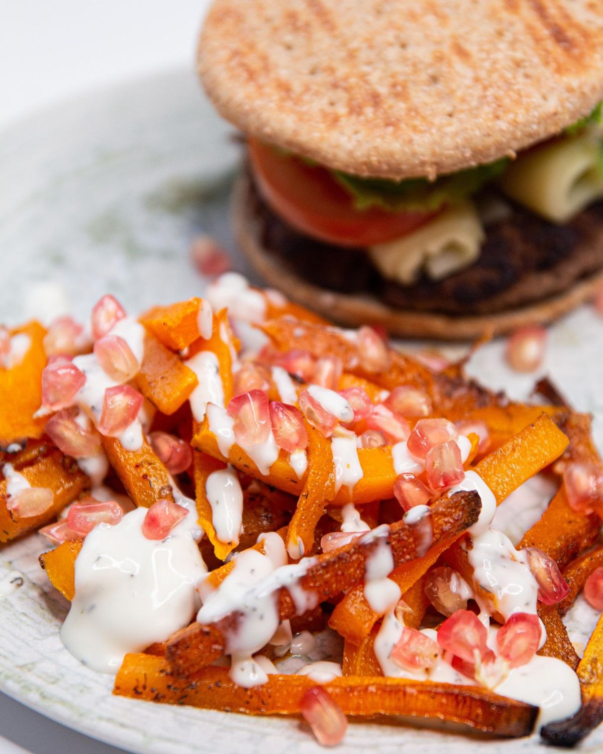 - Para terminar, añadimos la salsa de yogur y las semillas de granada